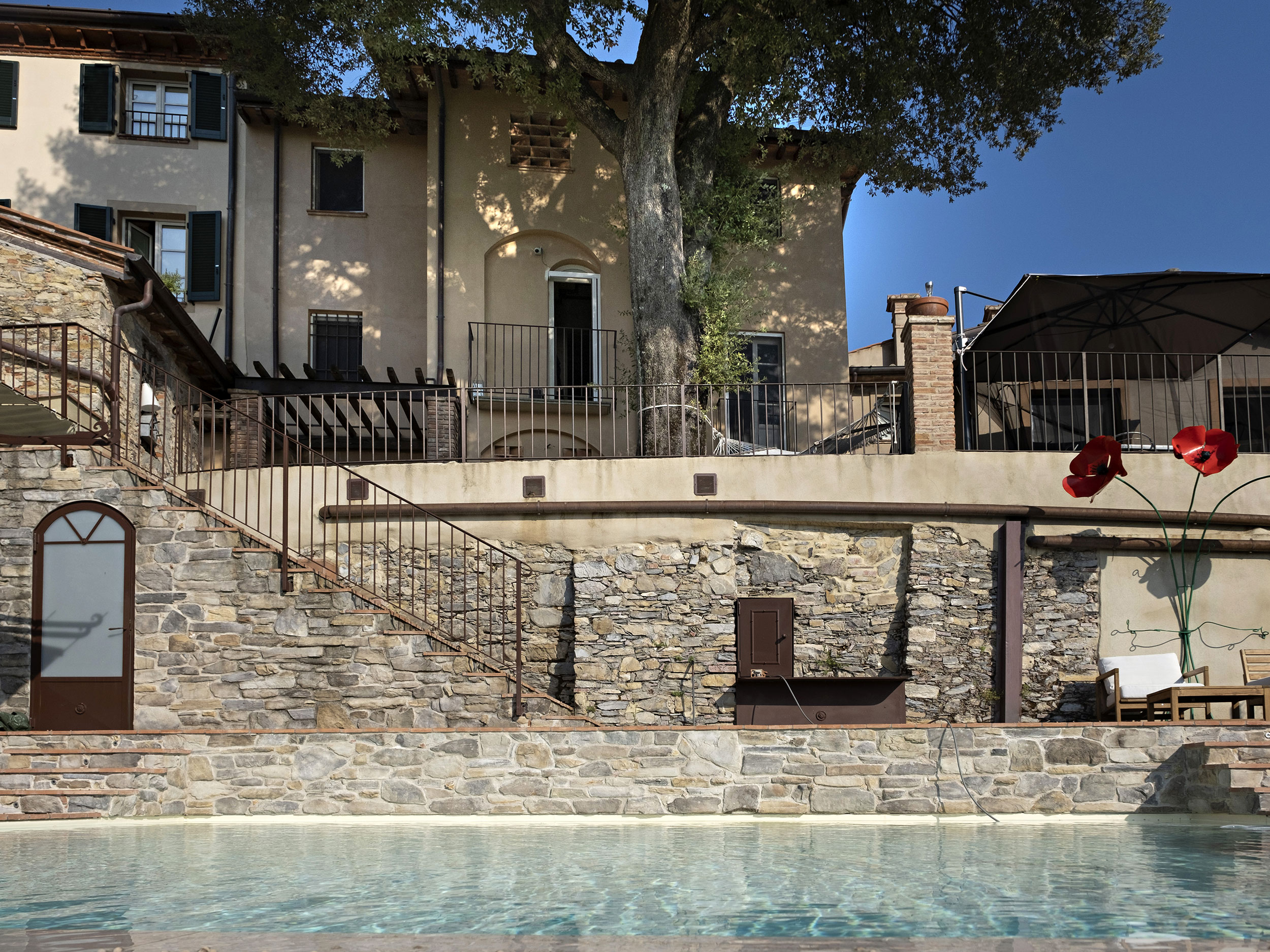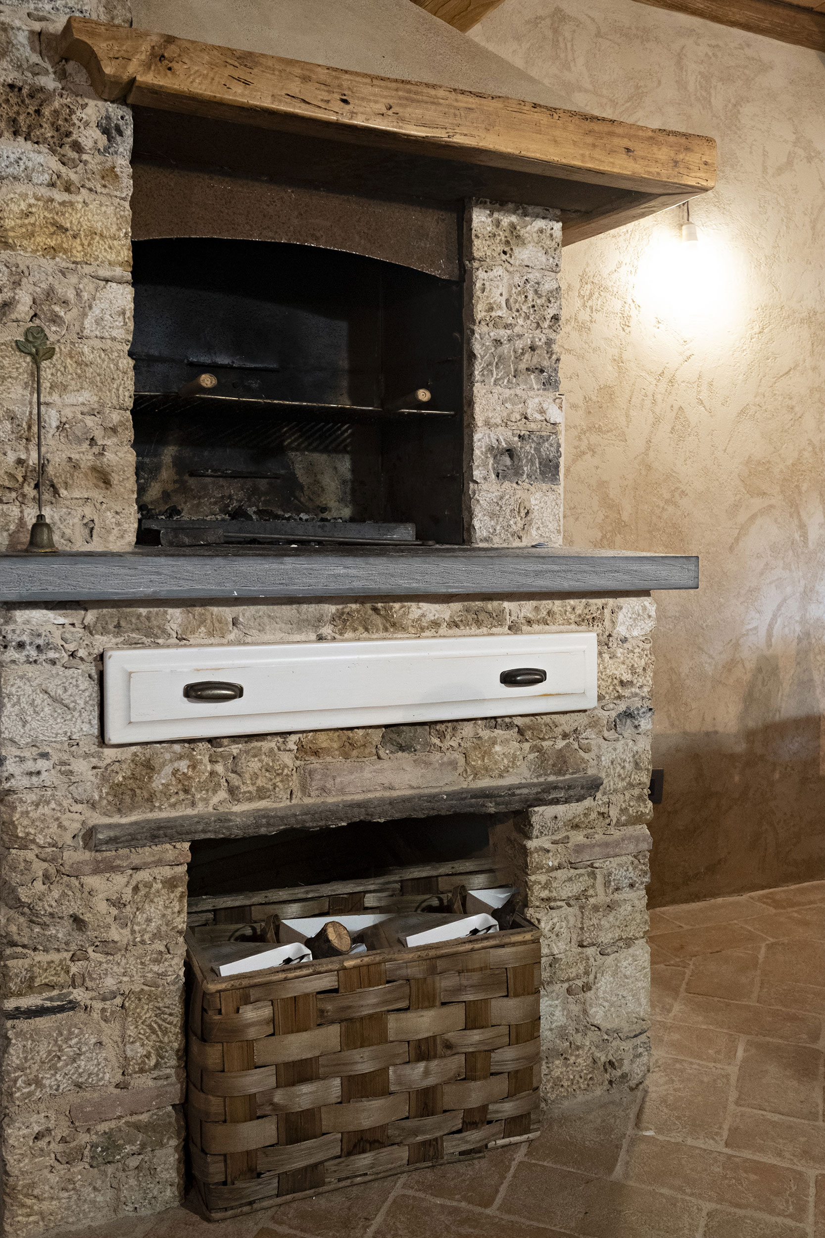 Sono stati realizzati archi in mattoni, rasature a calce lisce e graffiate, rivestimenti dei bagni in travertino color noce, scala con struttura in ferro e rivestimento in legno invecchiato, infissi e porte in legno in stile tipico toscano ed un caratteristico camino nel soggiorno ed un camino-barbecue in cucina.