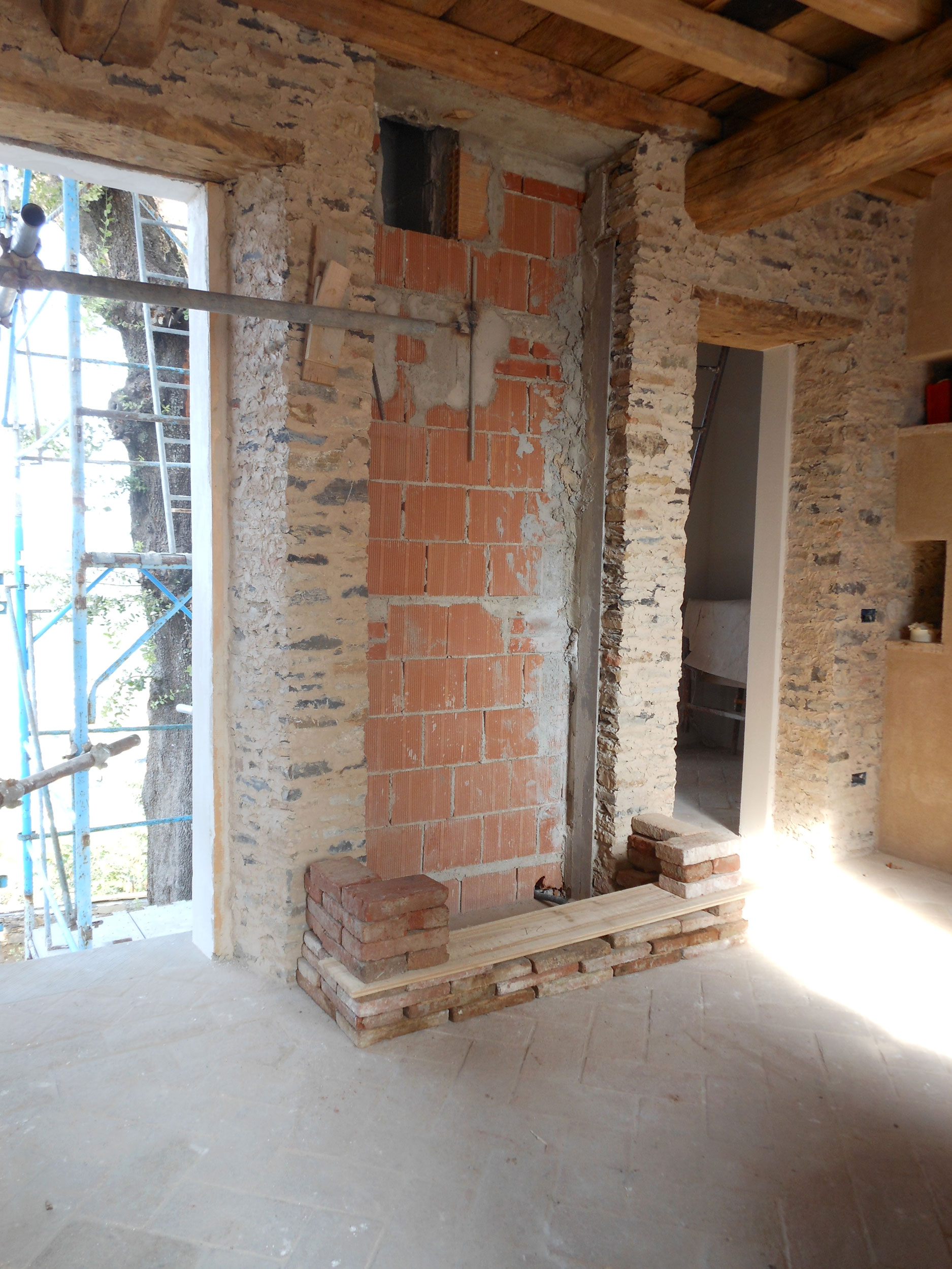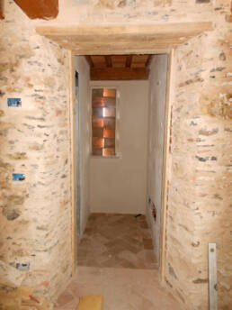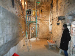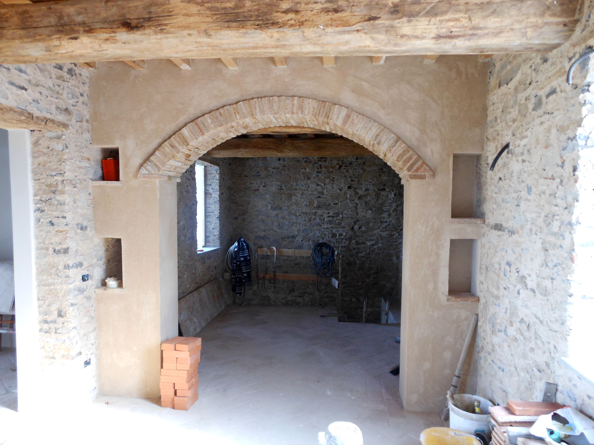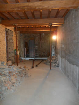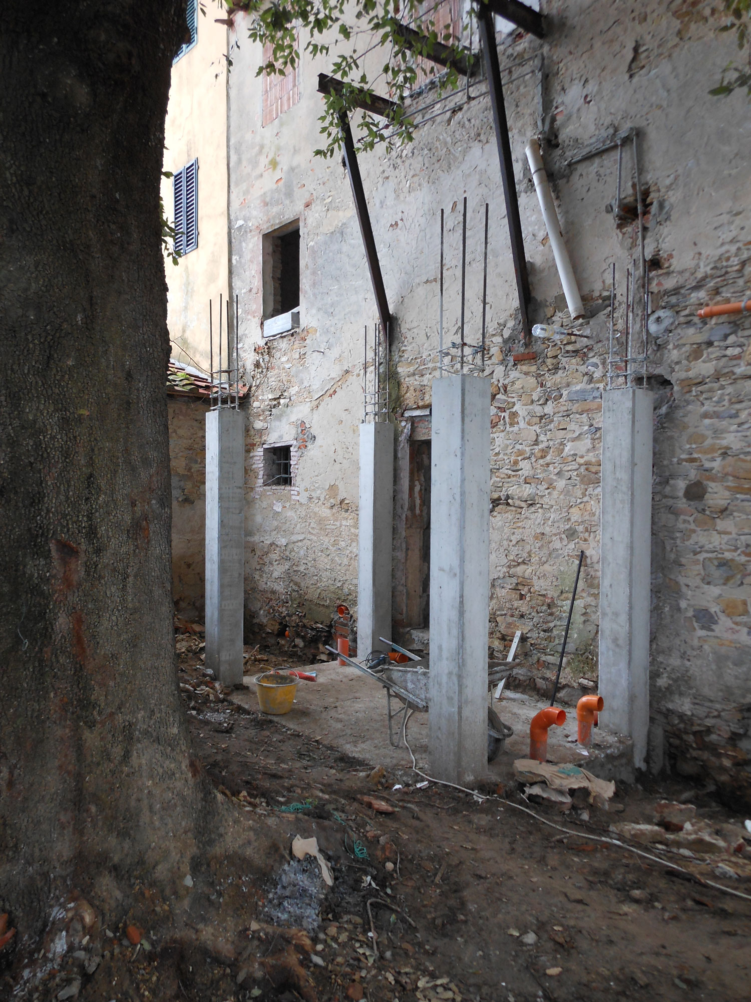 Sono stati realizzati scavi, opere di impermeabilizzazione, muri in c.a mono faccia nel locale seminterrato in controspinta, cerchiature e rivestimento delle stesse in pietra recuperata, tagliata e lavorata sul posto assemblando ad arte strutture in cemento armato e acciaio.