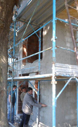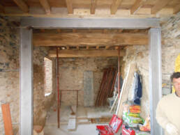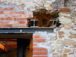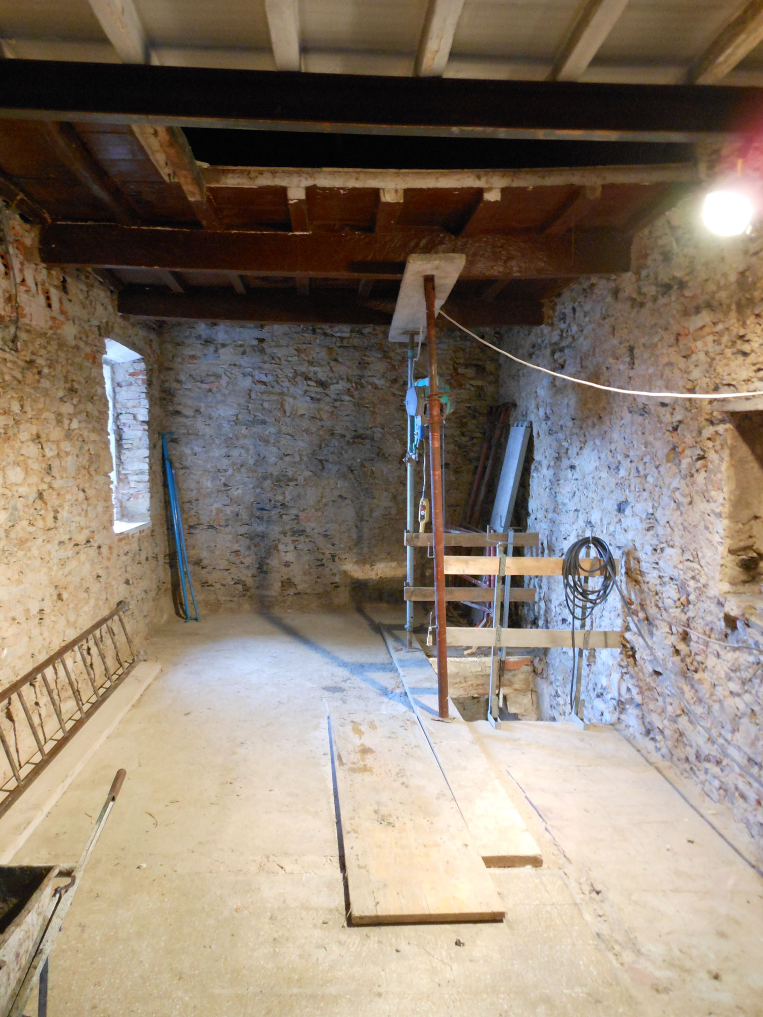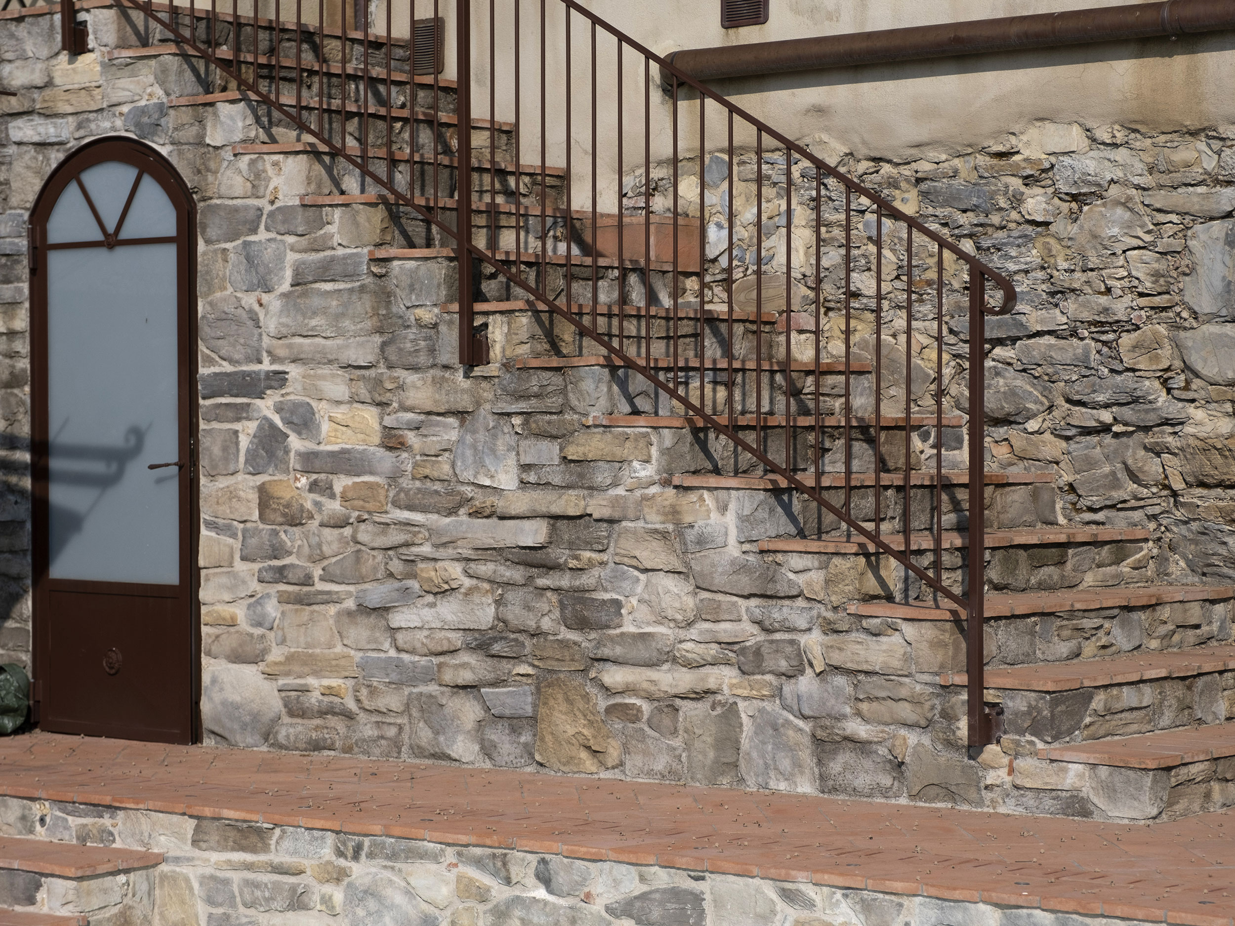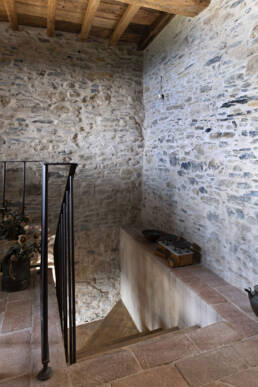 Sono stati realizzati scavi, opere di impermeabilizzazione, muri in c.a mono faccia nel locale seminterrato in controspinta, cerchiature e rivestimento delle stesse in pietra recuperata, tagliata e lavorata sul posto assemblando ad arte strutture in cemento armato e acciaio.