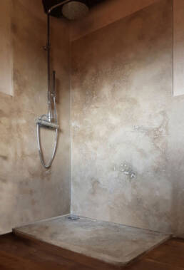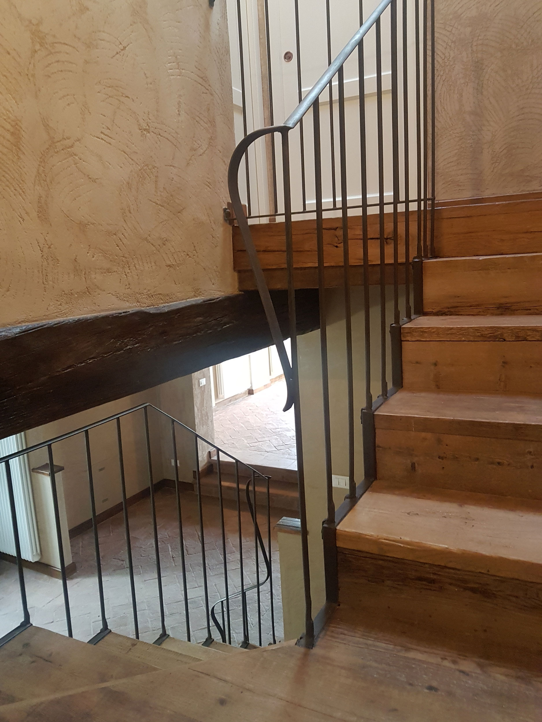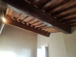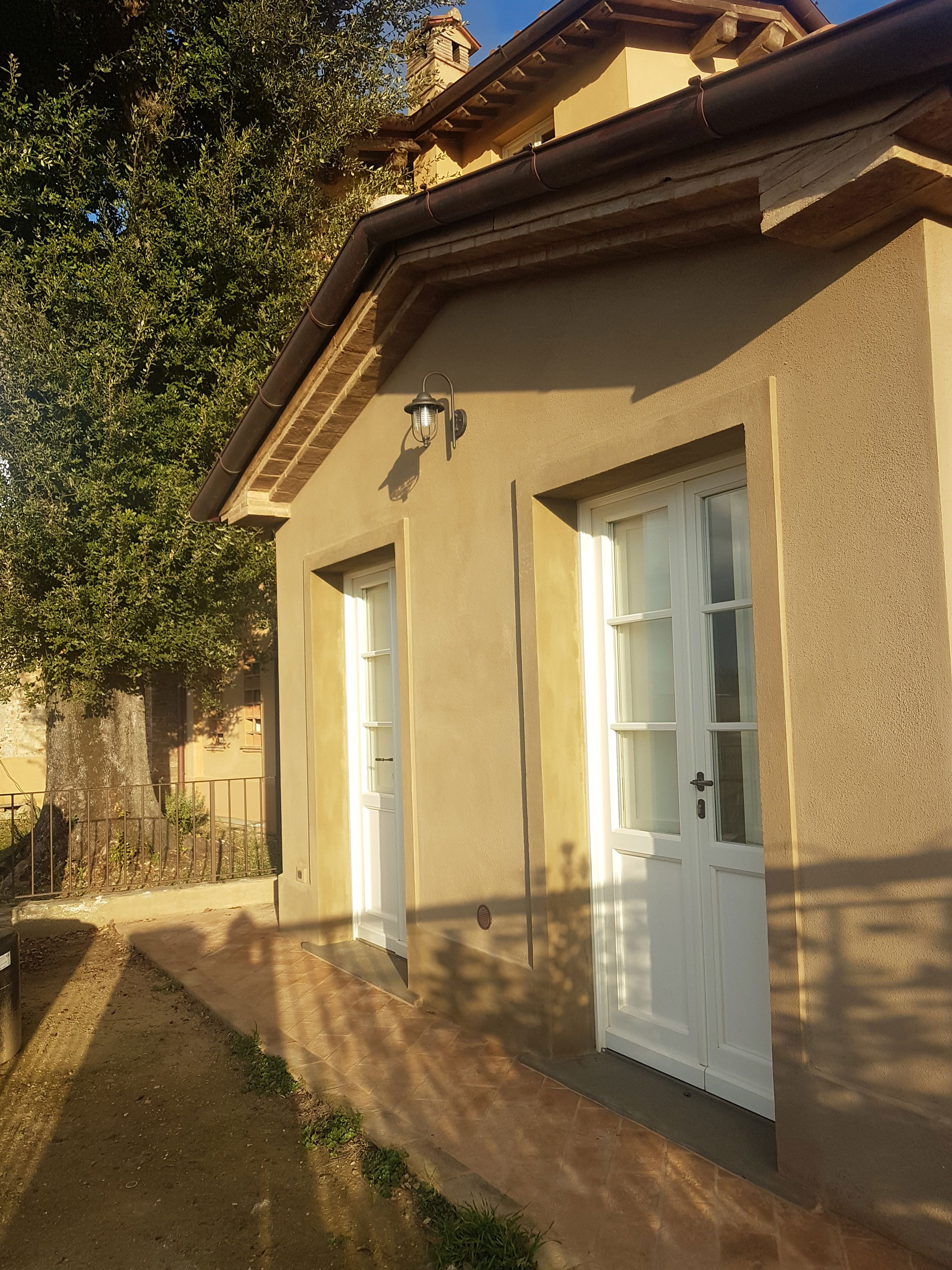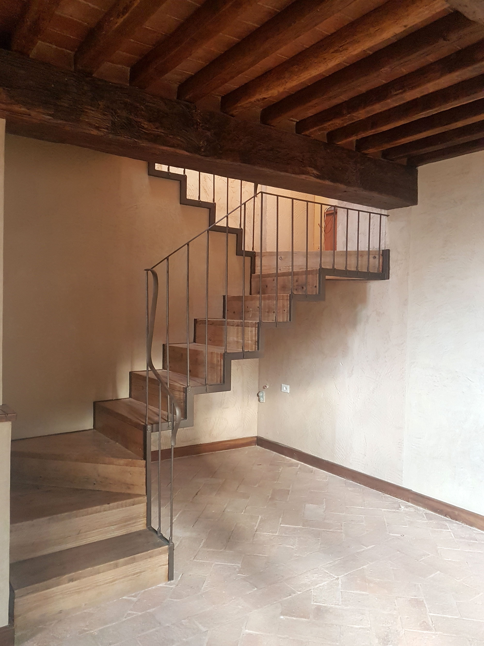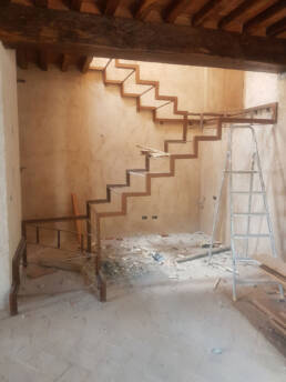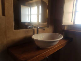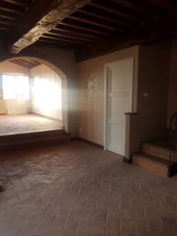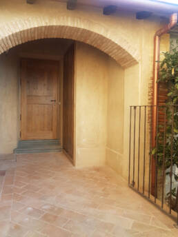 Abbiamo utilizzato materiali certificati di alta qualità e per le finiture pietra recuperata sul posto, travi in rovere antico utilizzate per la ricostruzione dei solai e delle pavimentazioni, mezzane anticate per il rifacimento delle pavimentazioni, archi in mattoni, infissi interni ed esterni in legno nel tipico stile toscano, scala in ferro rivestita in legno, scala esterna in pietra serena, rivestimenti dei bagni in travertino color noce e rasature a calce lisce e graffiate.