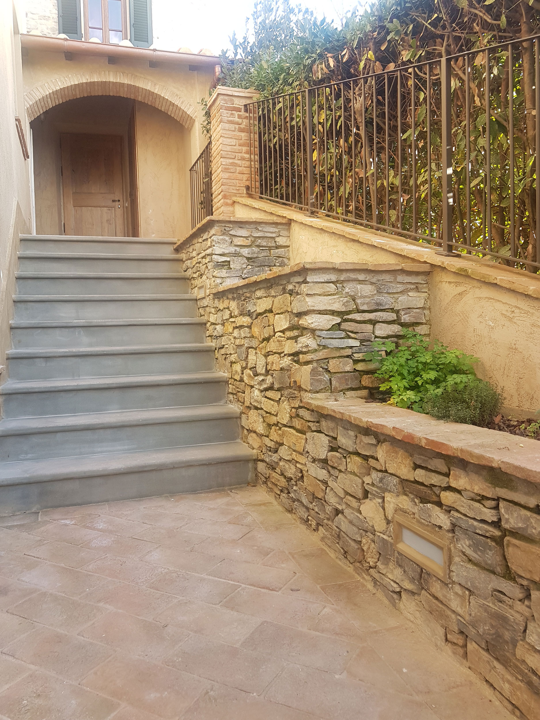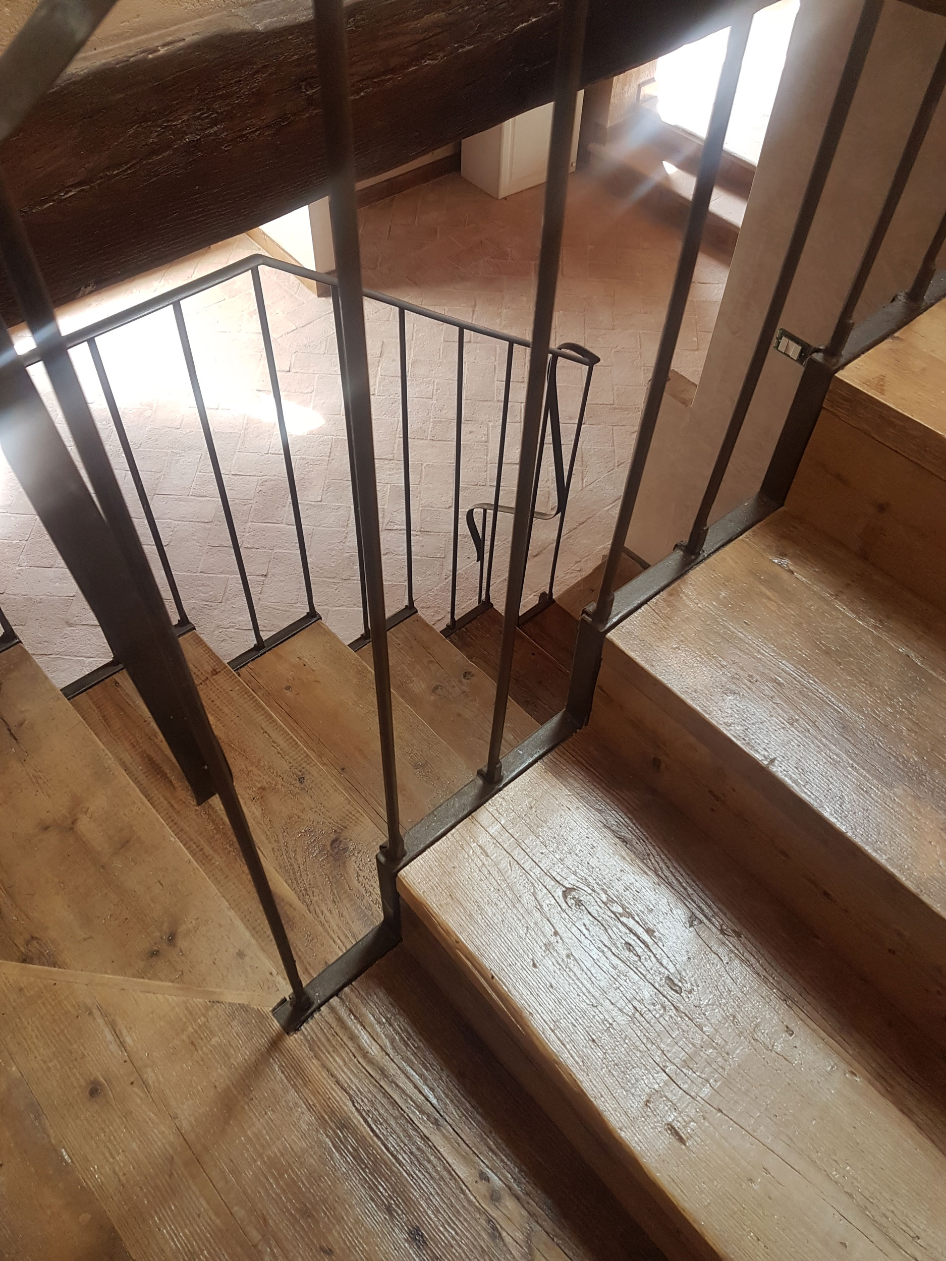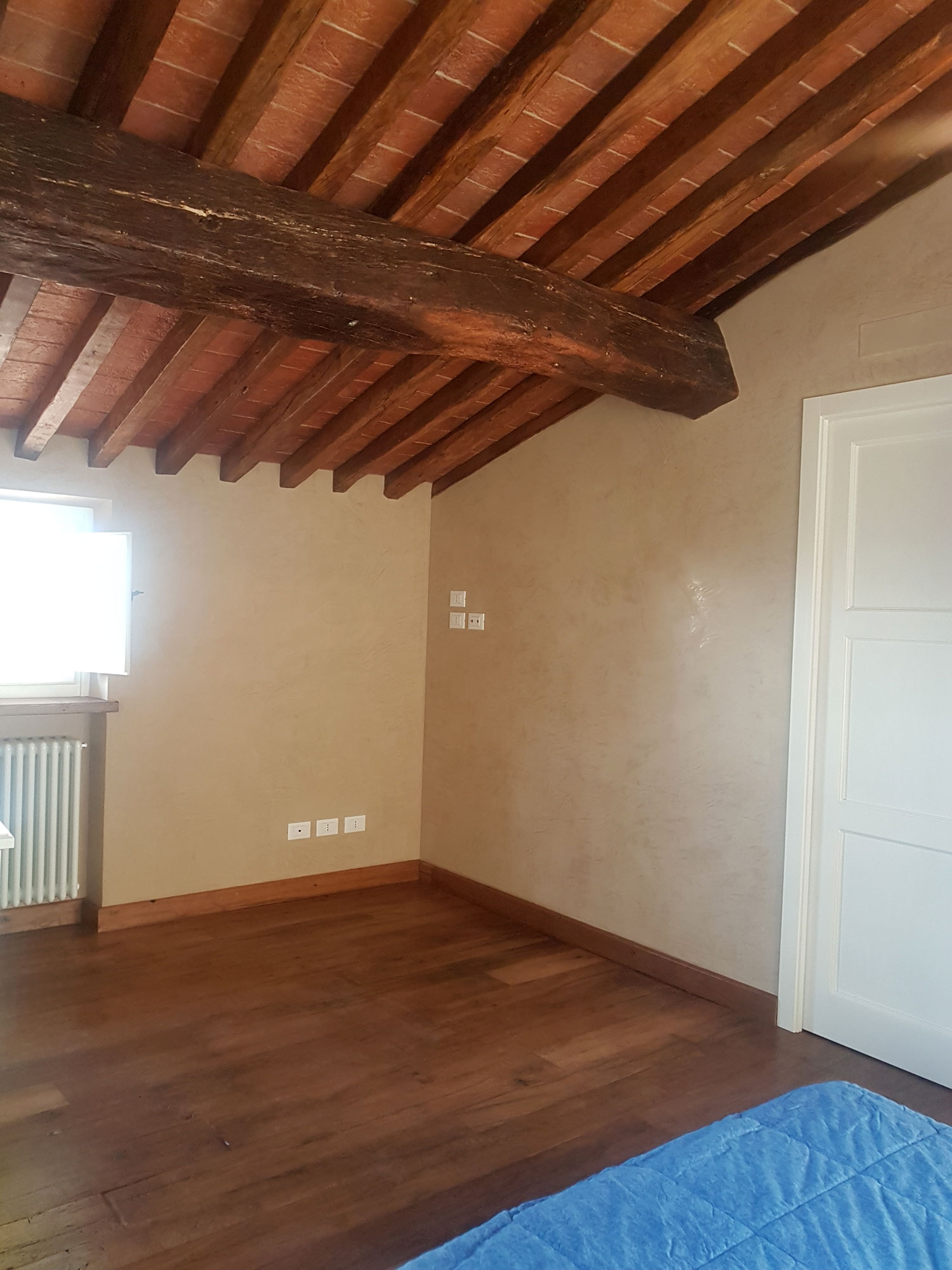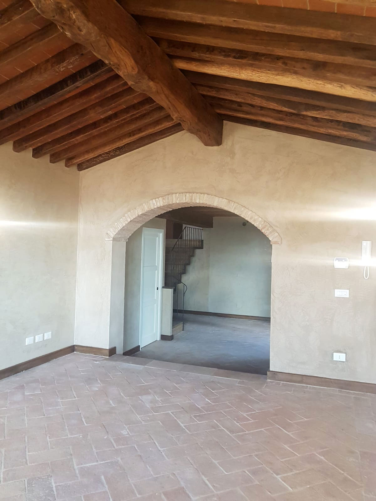 Abbiamo utilizzato materiali certificati di alta qualità e per le finiture pietra recuperata sul posto, travi in rovere antico utilizzate per la ricostruzione dei solai e delle pavimentazioni, mezzane anticate per il rifacimento delle pavimentazioni, archi in mattoni, infissi interni ed esterni in legno nel tipico stile toscano, scala in ferro rivestita in legno, scala esterna in pietra serena, rivestimenti dei bagni in travertino color noce e rasature a calce lisce e graffiate.