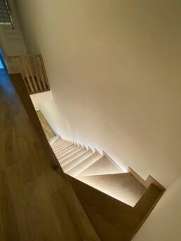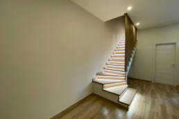 Villino light è stato rifinito con pavimenti in gres effetto legno con la particolarità della scala realizzata con struttura in acciaio che rivestita in legno e finemente illuminata arricchisce l’ambiente con ulteriore eleganza.